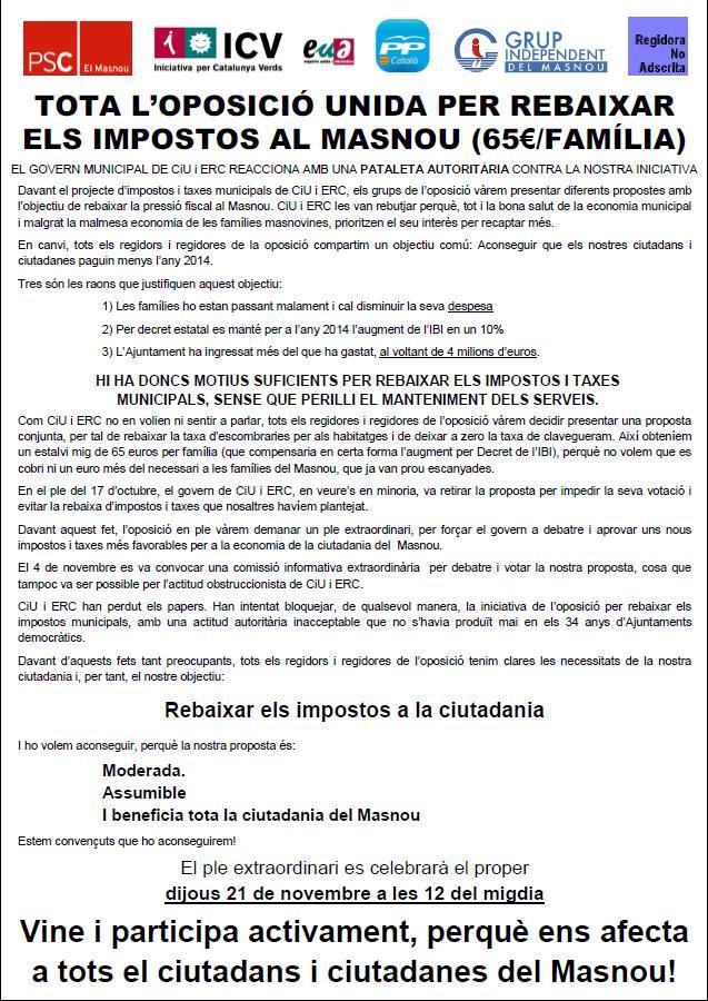 L’oposició en ple, 11 regidors i regidores de grups tant diversos com el Partit Popular i Iniciativa, han força la convocatòria d’un Ple extraordinari el proper dia 21 per fer una rebaixa d’impostos mitjançant la modificació de les ordenances fiscals. L’oposició calcula que aquesta rebaixa permetrà a cada família disposar de 65€ més durant el proper any 2014.